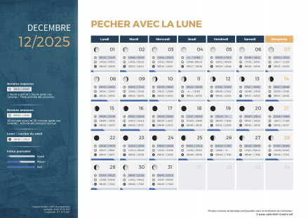 Toutes les données lunaires et solaires pour anticiper l'activité des poissons et préparer au mieux ses sorties pêche. Pour apprendre à utiliser ce calendrier, consultez la page sur comment pêcher avec la lune.