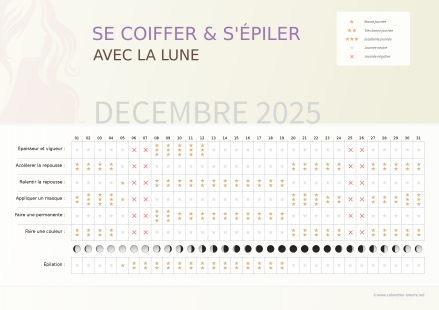 Pour des cheveux épais et vigoureux, ou encore pour accélérer ou ralentir la repousse, il convient de se couper les pointes des cheveux pendant les périodes indiquées afin d'obtenir l'effet désiré.